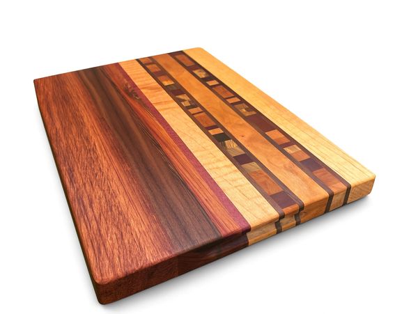 Each board is hand-crafted using carefully selected hardwoods chosen for their beauty, durability, and unique grain patterns. The balance of light and dark woods highlights the geometry of the design while showcasing the natural variations that make every board one of a kind.